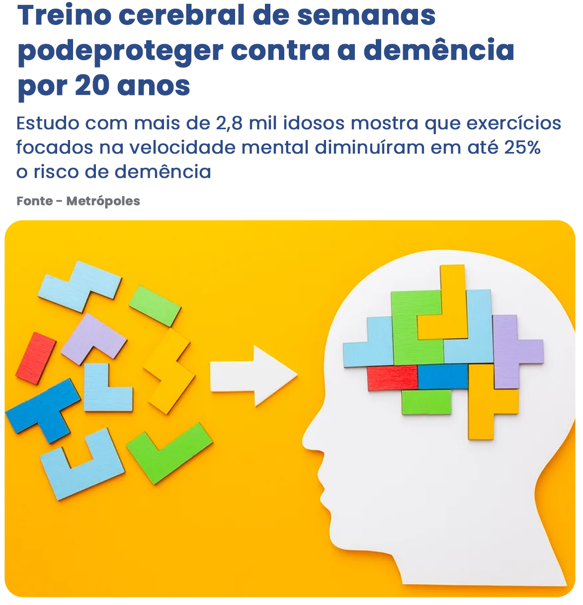 Quer ter um cérebro turbinado em qualquer idade? A plataforma de treinamento cognitivo digital da NeuroForma oferece exercícios que ajudam a sintonizar o seu cérebro. Treinos de concentração, rapidez de raciocínio, habilidades sociais, inteligência e de orientação espacial. Acesse e confira AQUI.