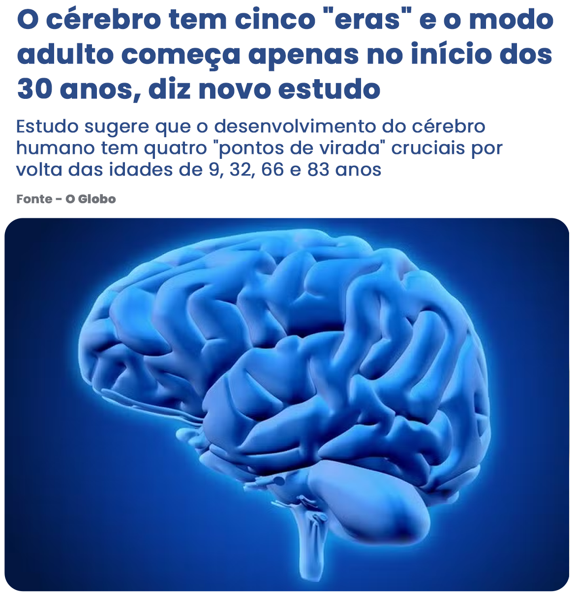 O cérebro humano tem cinco grandes “eras” de desenvolvimento, de acordo com um dos estudos mais abrangentes até hoje sobre como as conexões neurais se alteram da infância à velhice. O trabalho, publicado na revista científica Nature Communications, se baseou em exames cerebrais de quase 4 mil pessoas com idades entre menos de um ano e 90 anosOs pesquisadores mapearam conexões neurais e como elas evoluem ao longo da vida. Os resultados revelaram cinco fases amplas, divididas por quatro “pontos de virada” cruciais, nos quais a organização cerebral segue uma trajetória diferente, por volta dos 9, 32, 66 e 83 anos de idade.