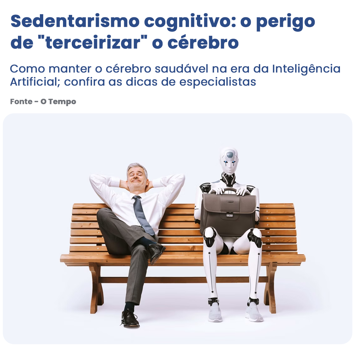 Um cérebro sem “malhação” é chamado de sedentarismo cognitivo. “É quando a pessoa passa a não fazer mais um esforço mental ou decide terceirizá-lo, usando (em seu lugar) a tecnologia, como a inteligência artificial. Ela delega processos mentais a recursos externos para poupar essa carga cognitiva ou mesmo porque não está disposta a fazer esse esforço mental”, explica o doutor Philipe Marques da Cunha, neurologista da Afya Educação Médica Belo Horizonte.